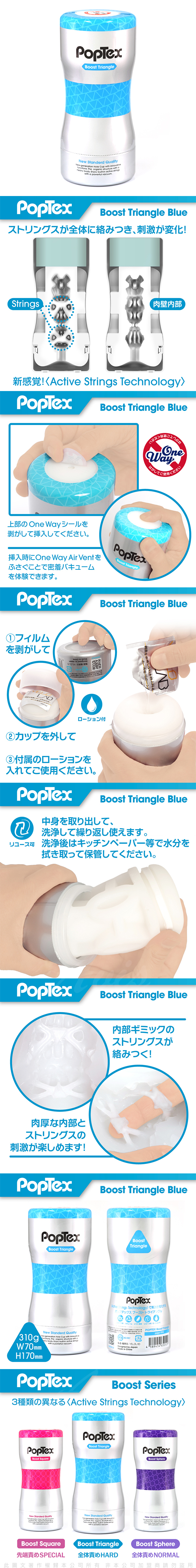 藍色 三角形:最刺激款,內部獨特設計,猶如迎面而來的狂浪漩渦,加上內部翻花繩構造,緊緊纏繞你的肉棒,設計為兩段式,加了兩個三角猶如女生的小虎牙,配合上下動作,產生雙向刺激,讓你想逃也逃不了
