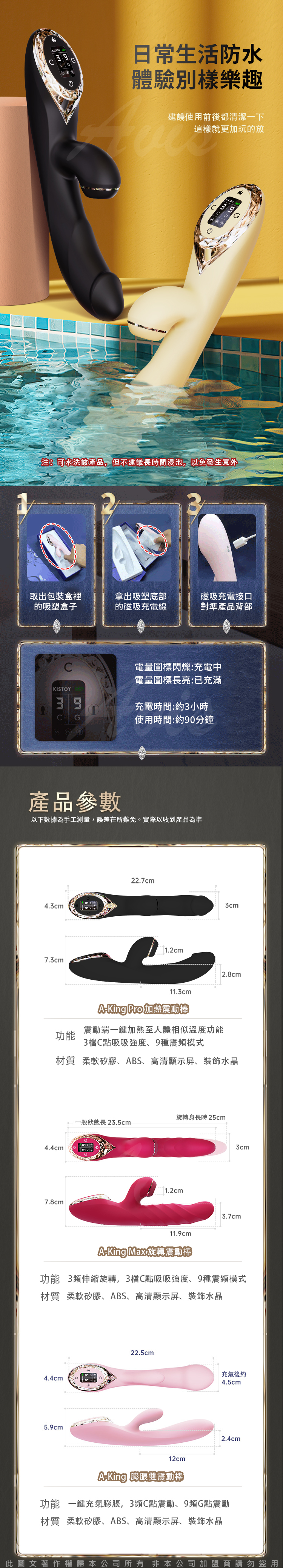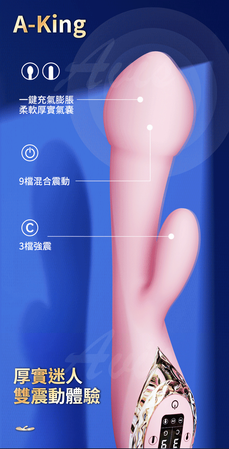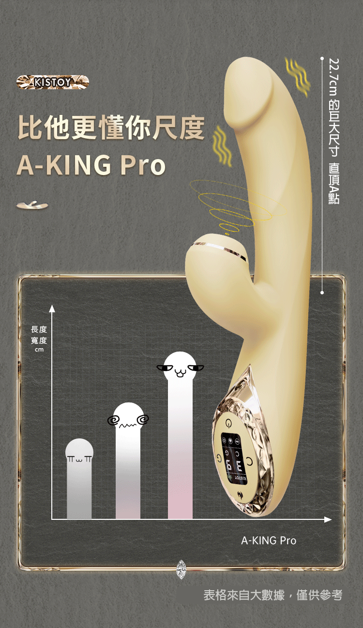 A-KING,直達A點!讓A-KING告訴你它在哪裡!A點位於陰道口約12厘米處,全稱“前穹窿”,是女性通過適當刺激達到性高潮的地方,是一個相對較新的位置。A點會產生舒緩的快感,是一個神奇的地方,可以在短時間內達到更多次性高潮!A-KING還可以同時刺激C點,而且由於它的長度和弧度,G-點也可以兼顧。也就是說,A-KING將為您帶來ACG三點的體驗!