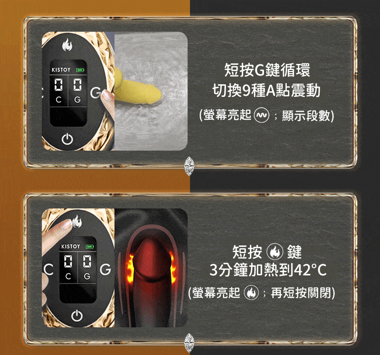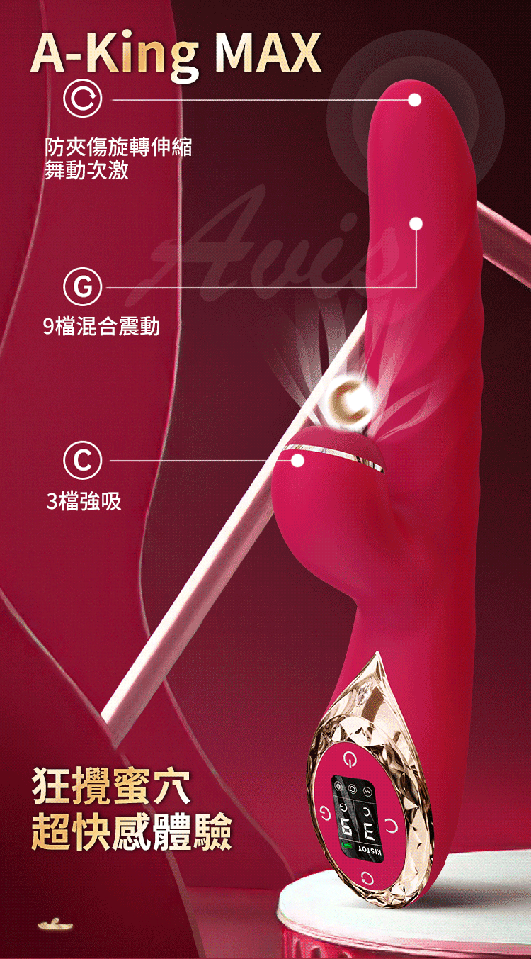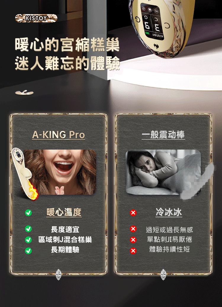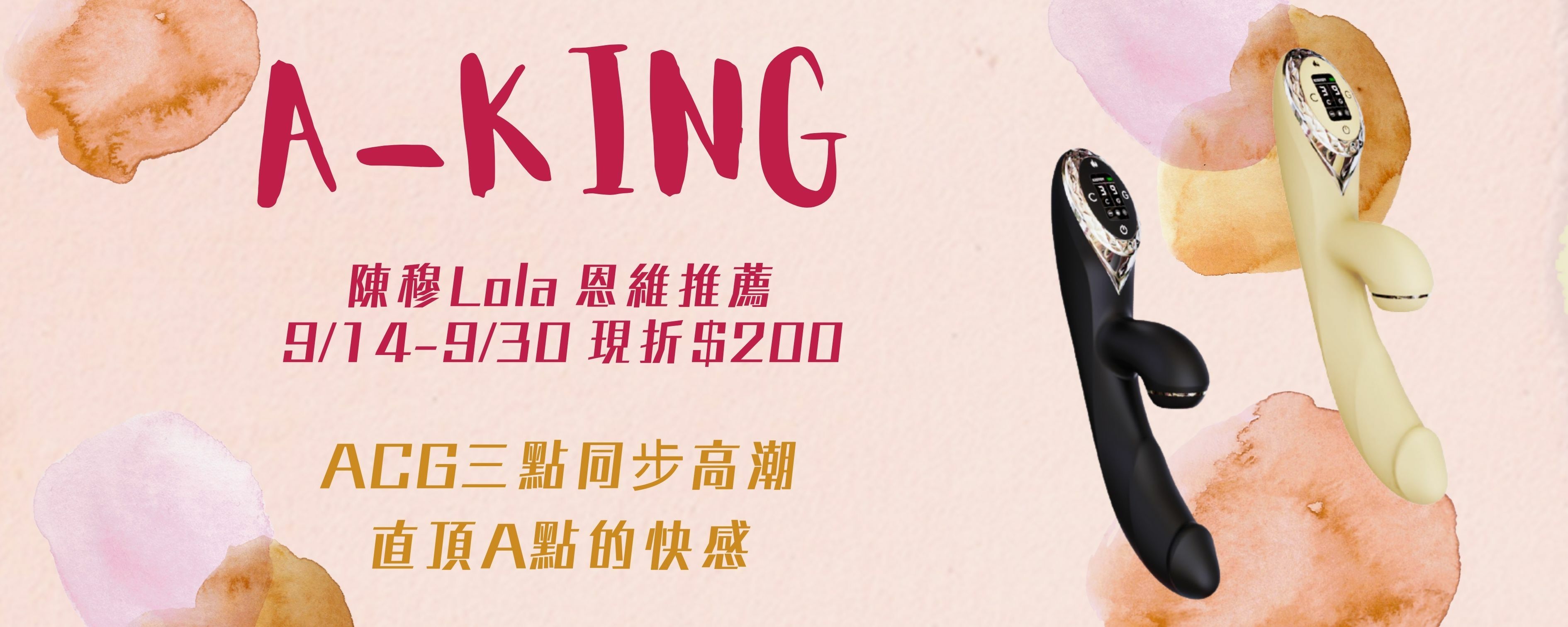 A-KING,直達A點!讓A-KING告訴你它在哪裡!A點位於陰道口約12厘米處,全稱“前穹窿”,是女性通過適當刺激達到性高潮的地方,是一個相對較新的位置。A點會產生舒緩的快感,是一個神奇的地方,可以在短時間內達到更多次性高潮!A-KING還可以同時刺激C點,而且由於它的長度和弧度,G-點也可以兼顧。也就是說,A-KING將為您帶來ACG三點的體驗!