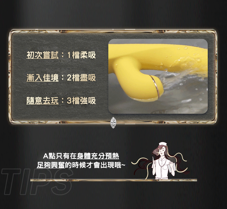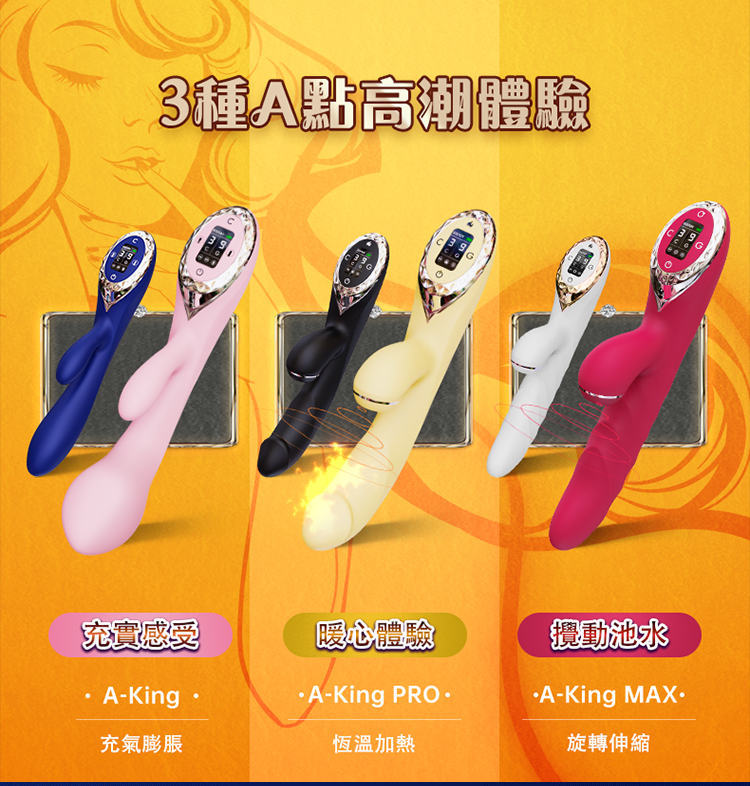 A-KING,直達A點!讓A-KING告訴你它在哪裡!A點位於陰道口約12厘米處,全稱“前穹窿”,是女性通過適當刺激達到性高潮的地方,是一個相對較新的位置。A點會產生舒緩的快感,是一個神奇的地方,可以在短時間內達到更多次性高潮!A-KING還可以同時刺激C點,而且由於它的長度和弧度,G-點也可以兼顧。也就是說,A-KING將為您帶來ACG三點的體驗!