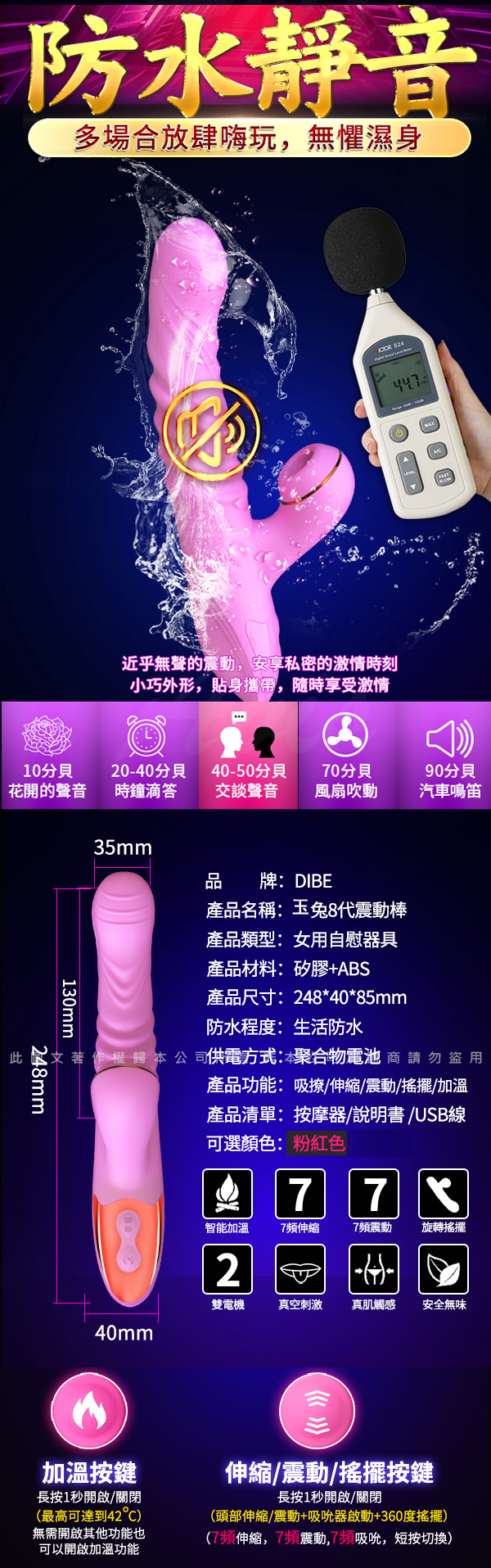 ![]() 7頻搖擺伸吸吮陰蒂 【注意事項】 1、本商品僅供情侶間使用,使用前後請注意清潔衛生 【清洗注意事項】 【收納注意事項】 .商品名稱:Dibe-玉兔8代 吸吮G點+自動抽插+加溫 震動按摩棒 |