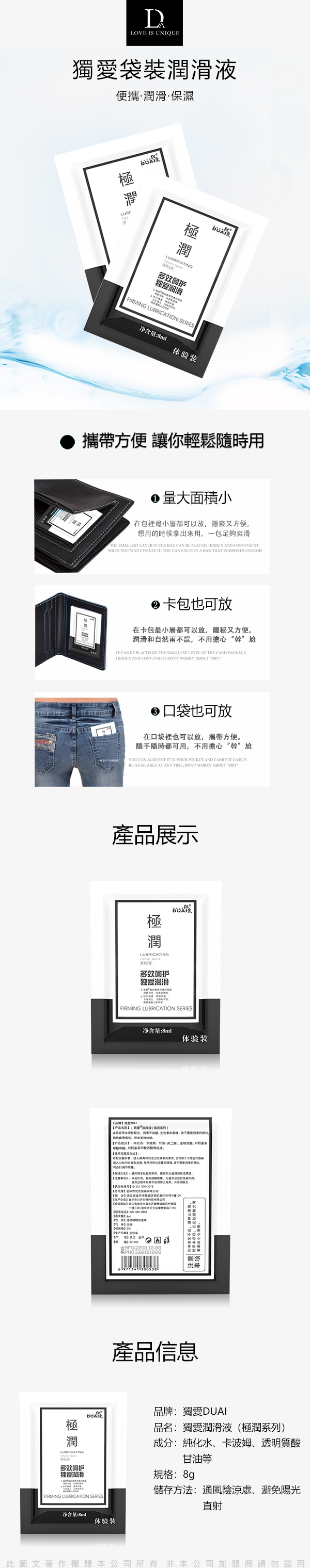 清新無味 【注意事項】 【清洗注意事項】 【收納注意事項】 .商品名稱:DUAI獨愛 極潤水溶性潤滑液 8ml x10包 |