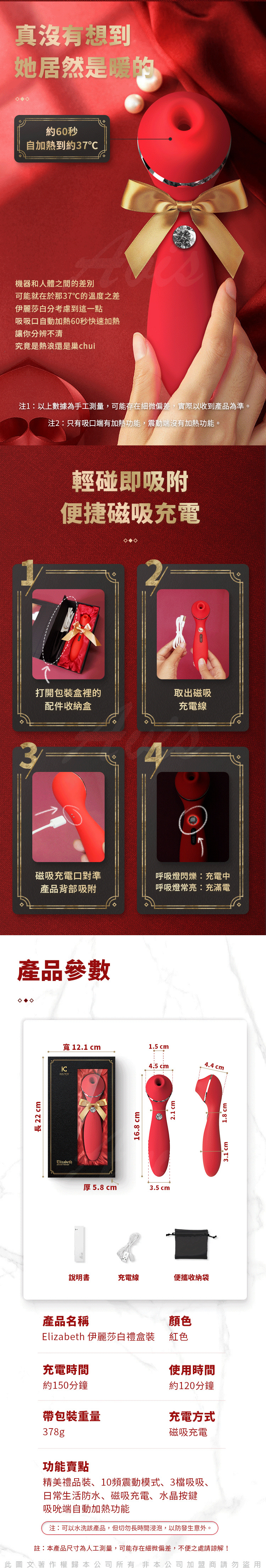 伊莉莎白的嘴,比平常得吸吮器都還大,接觸面積更寬能完整包覆我的陰蒂,吸吮範圍更大更強烈。三種吸吮模式就已經很足夠,配上加溫功能,吸起來比男友還舒服(。◕∀◕。)