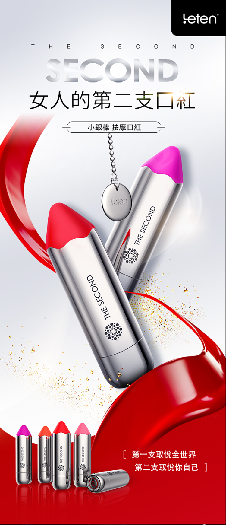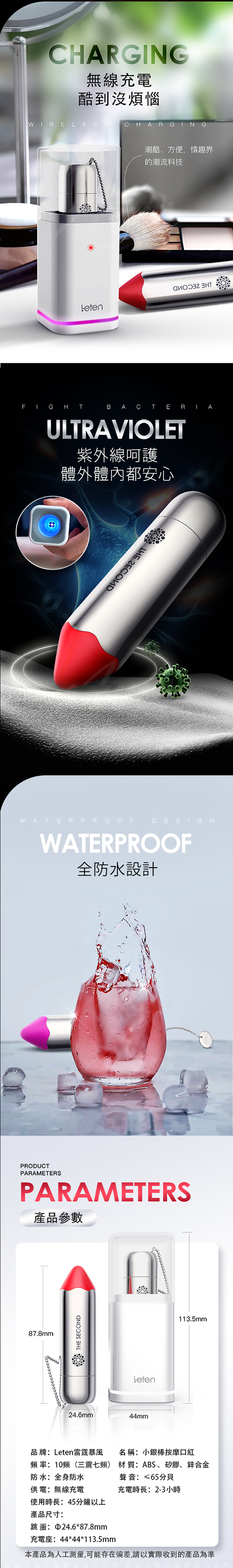 .主商品:Leten-小銀棒 10段變頻 無線充電防水口紅跳蛋 紫外線抑菌座充