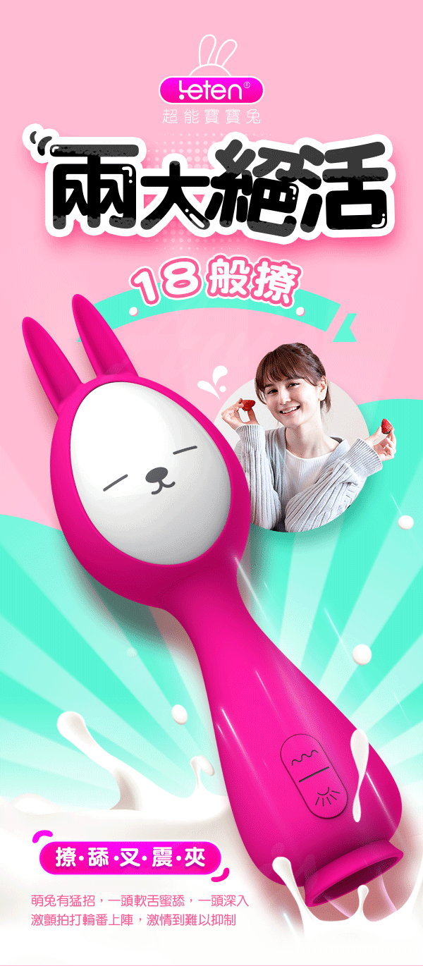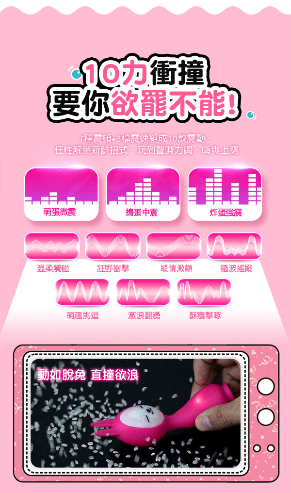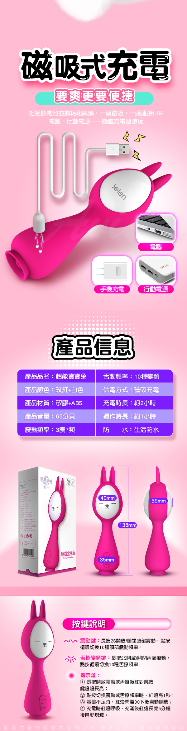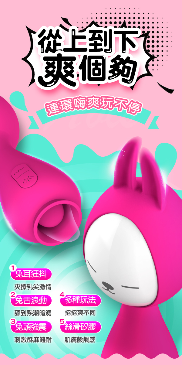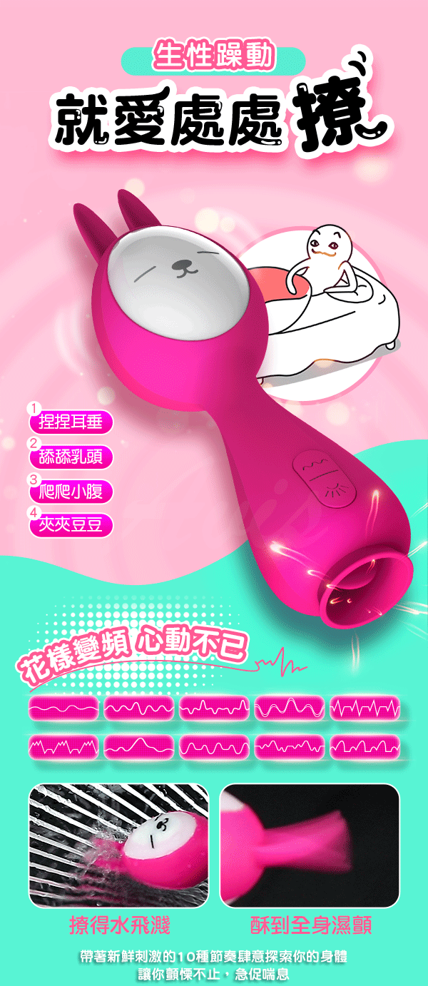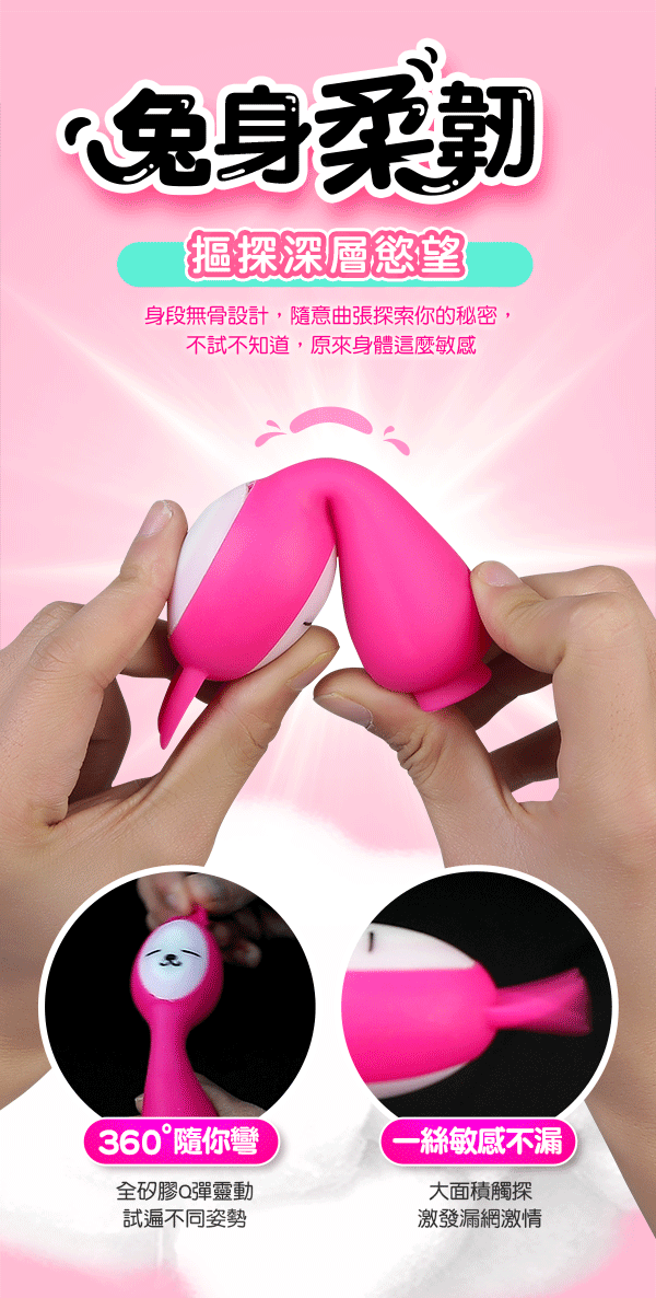 ![]() 萌兔有猛招,一頭軟舌蜜舔,一頭深入激顫拍打輪番上陣,激情到難以抑制。帶著10種新鮮刺激的變頻節奏肆意探索您的身體,讓您顫慄不已。為全矽膠無骨設計,可隨意彎曲輕鬆探索身體敏感點。擁有防水低噪讓您夜夜潮來潮去都不怕,事後清洗也方便喔~