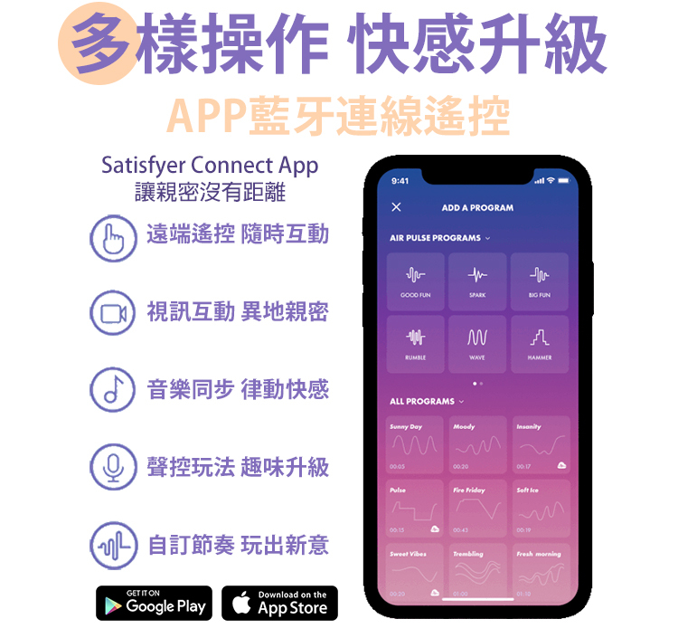 結合 Satisfyer Connect APP 智慧操控,除了能自創節奏、隨音樂起舞外,更支援跨越地理限制的遠端連線