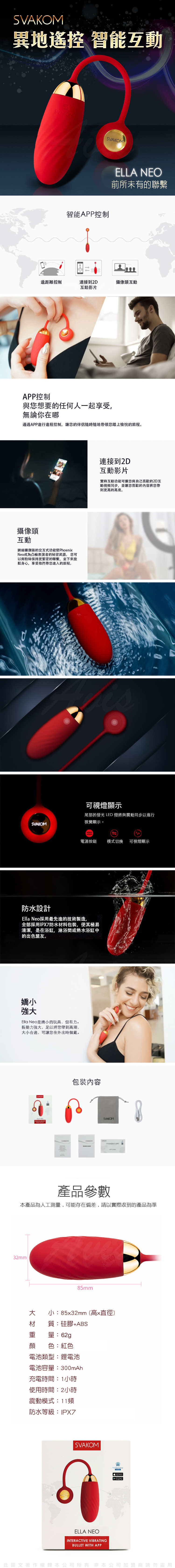 全新SVAKOM ELLA NEO 遙控震蛋,嶄新的智能操控設計,帶你體驗現代科技結合成人玩具的新樂趣!智能手機APP控制,通過智能手機下載SVAKOM APP,以手機連接ELLA NEO,便可以以手機操控SVAKOM ELLA NEO遙控震蛋。強勁的震動效能,加上人體工學的設計和螺旋紋的機身,為你帶來不一樣的享受,手機應用程式可調較六種不同震動模式,,而機身操作更可演變出多種不同的震動節奏,帶來刺激新體驗。Ella機身由超級柔軟的安全矽膠製成,除了容易清潔外,亦絕對防水。防水功能更能讓你即使浸浴時或在泳池當中,也能帶同你的玩具,和你的伴侶享受到不一樣的樂趣。適中的大小,讓你無論用於哪個位置,都能更易於刺激到專屬的敏感點。